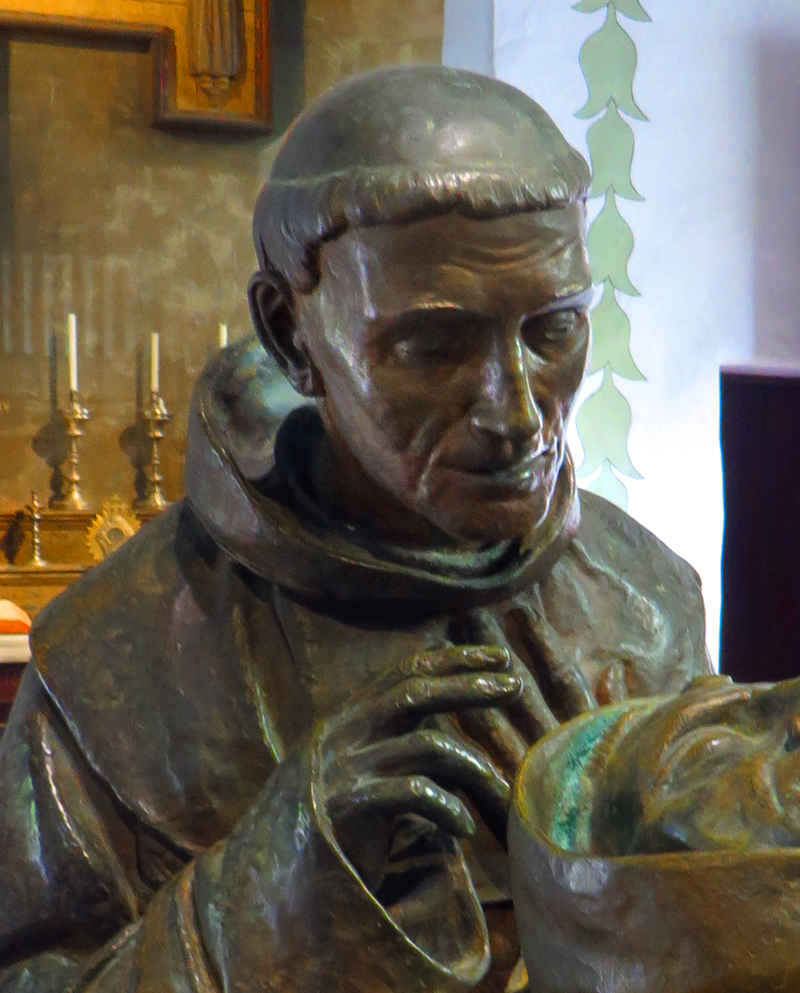 Statue of Crespí by artist Jo Mora (1876-1943), part of Mora's 1924 cenotaph (empty ceremonial tomb) for Fra. Serra at the Carmel Mission.