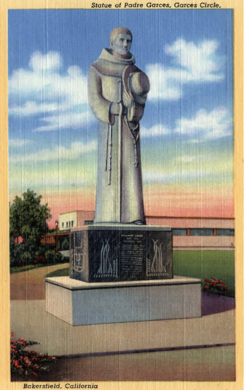Limestone statue of Father Francisco Garcés (1738–1781) in a traffic circle on U.S. Highway 99 in Bakersfield. Sculpted in 1939 by regional artist John Palo-Kangas.