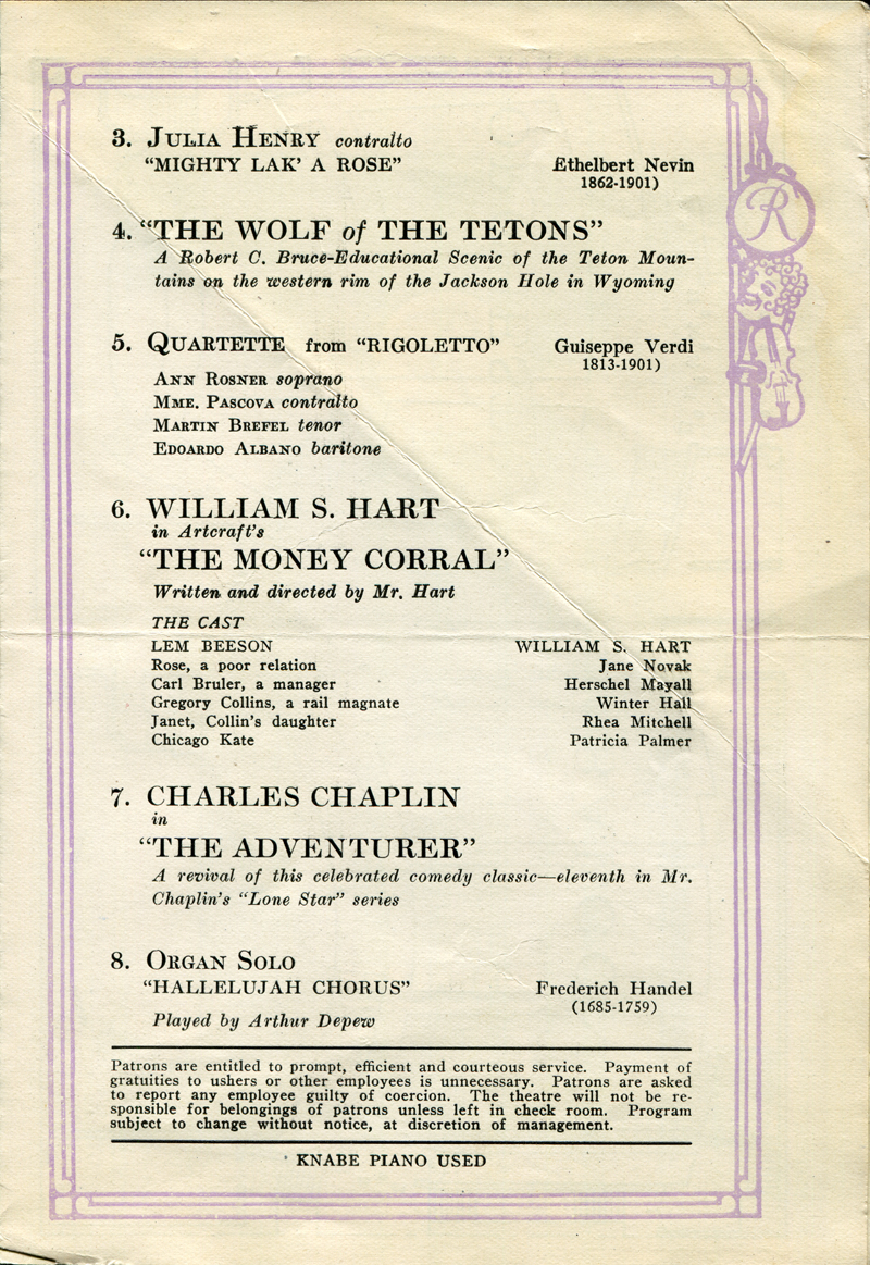 Rialto Theatre program for the Broadway premiere of "The Money Corral," April 20, 1919.