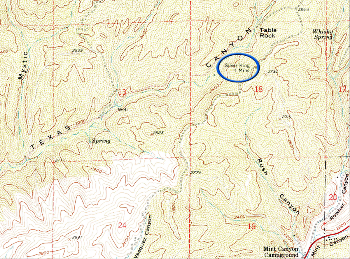 Roughly half way, you'll pass by the distinctive Table Rock feature. Keep going. You should see trail markers that say Silver King. The tunnel openings are on the left (southeast).