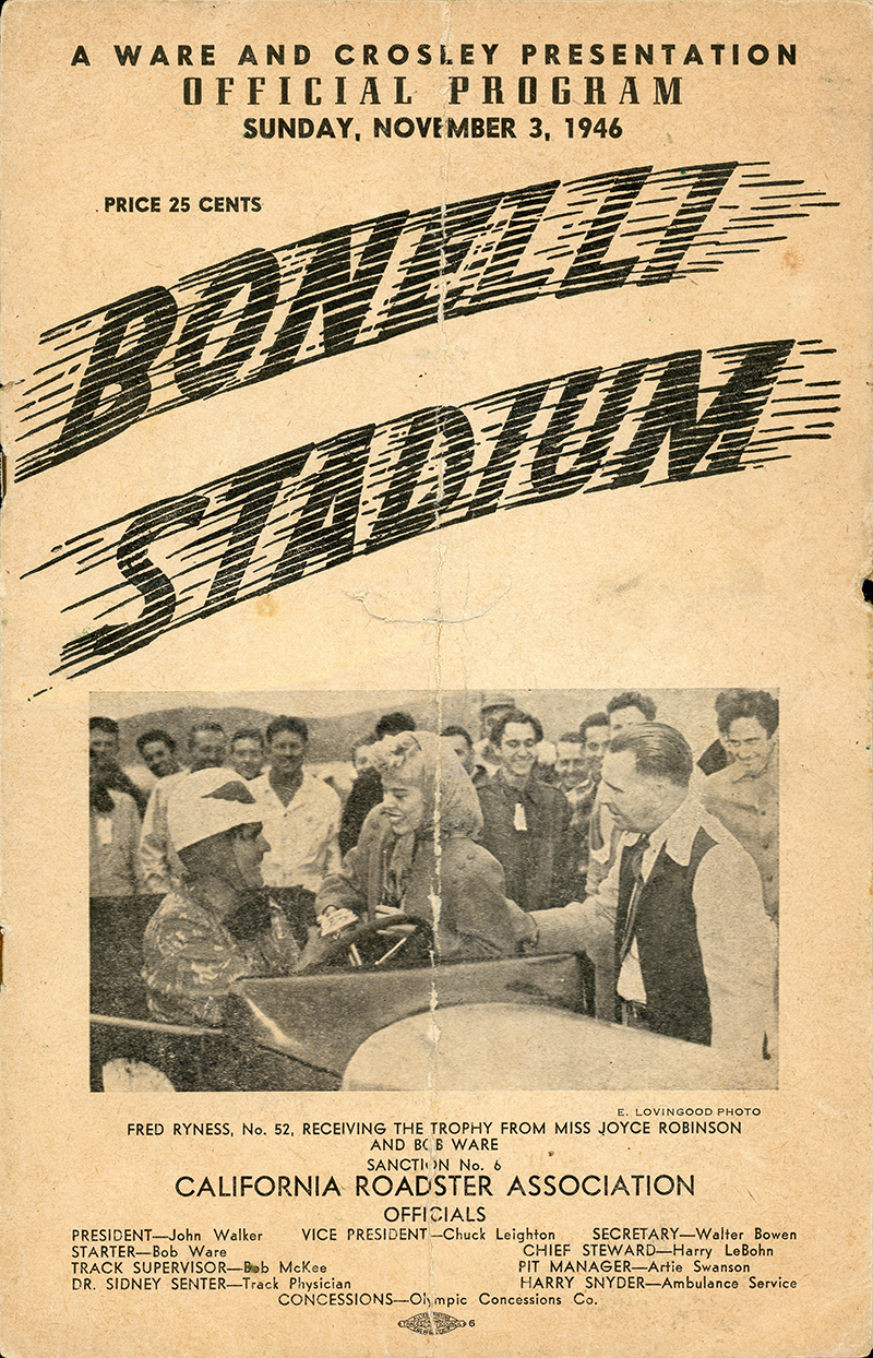 having won the first California Roadster Association championship (1946). From the handwritten race times in this program book, it appears McGrath was the winner on this day in Saugus, as well.