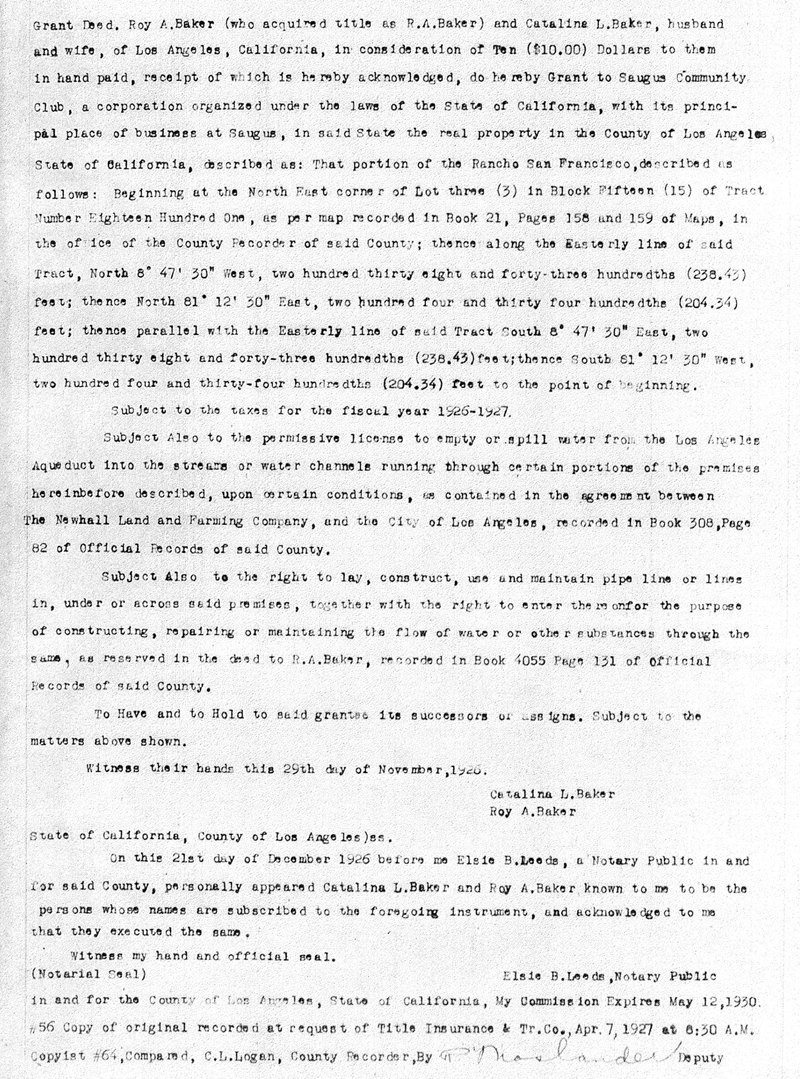 Above: Grant deed from Roy and Catalina Baker to the Saugus Community Club, 1926. Courtesy of Don Ray. Click to enlarge.