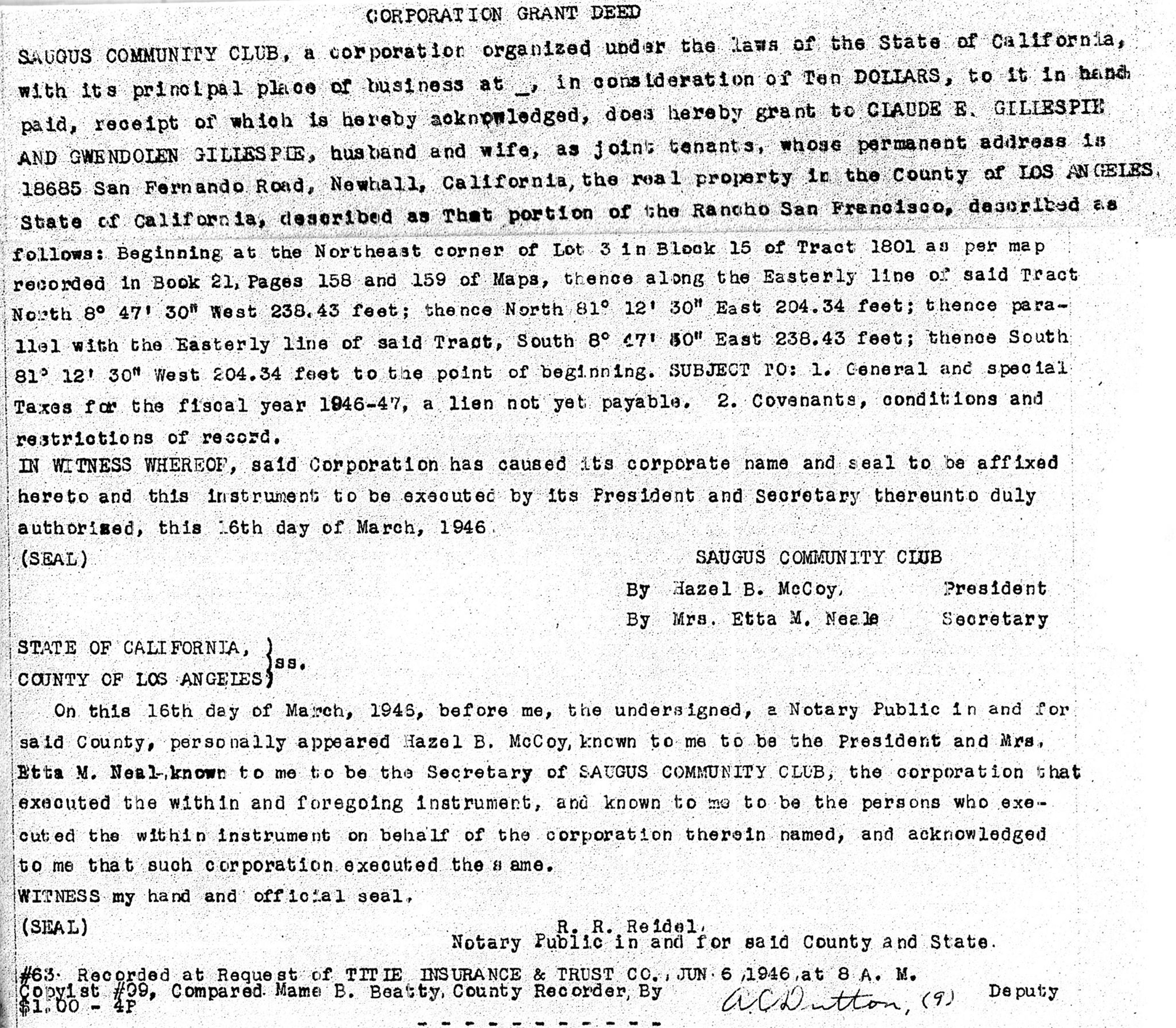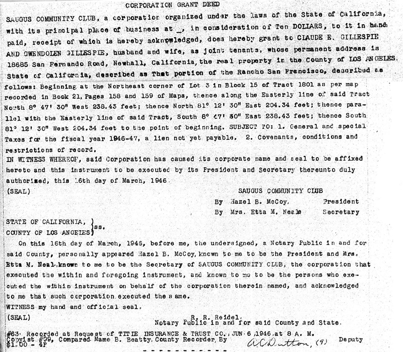 Above: Grant deed from the Saugus Community Club to Claude and Gwendolen Gillespie, 1946. Courtesy of Don Ray. Click to enlarge.