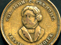 John C. Fremont medal, issued December 1913 by the Circle of Friends of the Medallion. No. 9 in a series of 12 issued between 1909 and 1915. Bronze, oval, 3 inches (75mm) wide by 2¼ inches (57mm) high. Front: Bust of Fremont with the words, Pathfinder / Scientist / Soldier at left and the sculptor's monogram at right. Back: Allegorical figure of a winged Victory seated on a pedestal above the California bear flag with ships to either side and agricultural products below.