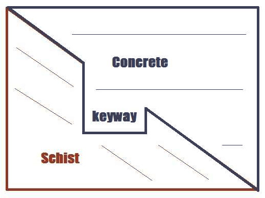 Jason Brice provides the diagram above to explain that they dug a hole or trench into the schist and poured the concrete into it and went up from there, in an effort to lock it into the remaining schist.
