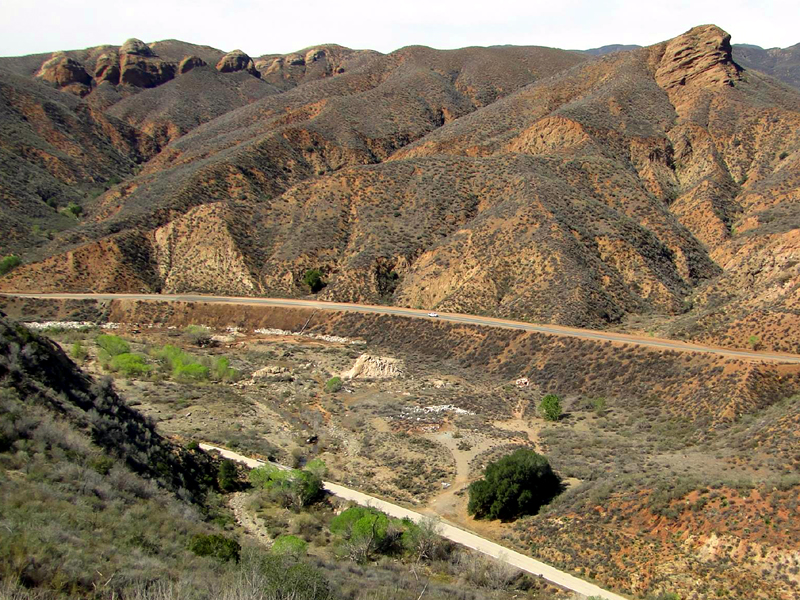 The force of 12.5 billion gallons of water sent giant chunks of the St. Francis Dam hurtling down-canyon. By the time the reservoir finished draining, the canyon was stripped of all vegetation up to the water line.