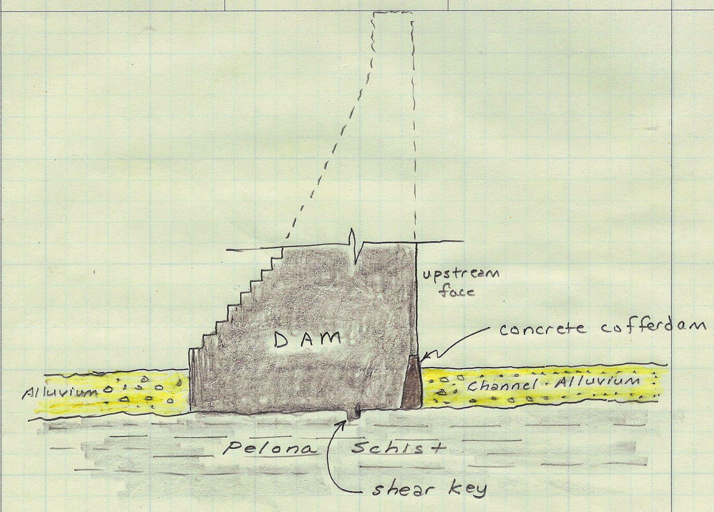 Rogers' sketch, at right, shows the relative size of the fairly small shear key, as well as the position of the 8-foot-high cofferdam incorporated into the upstream heel of the dam