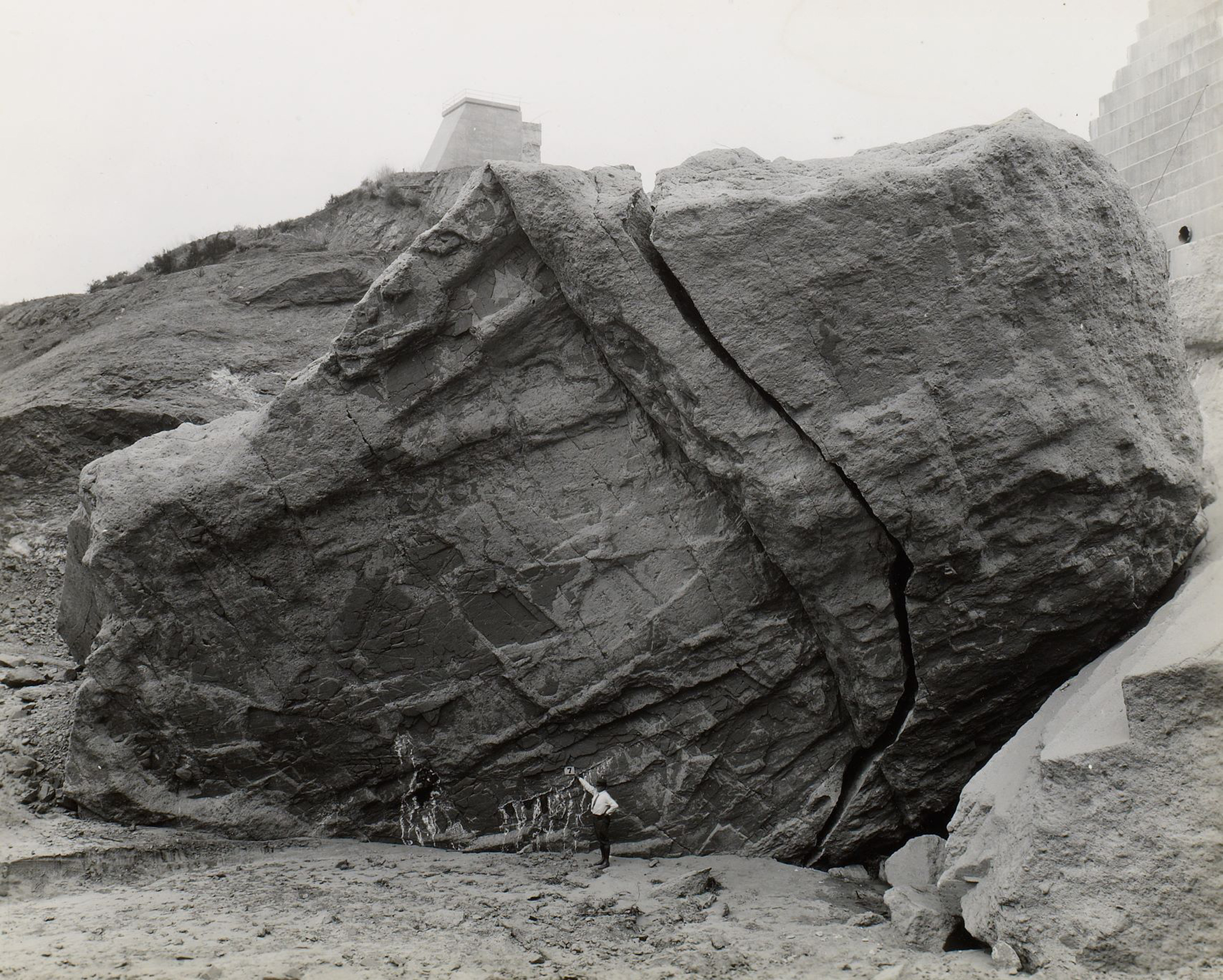"The bottom of Block 11 revealed a very small shear key had been excavated into the underlying Pelona Schist, ostensibly to increase the basal shear resistance. One can also catch a glimpse of the flood damage to San Francisquito Canyon Road, ascending the dam's left abutment, at lower middle left."