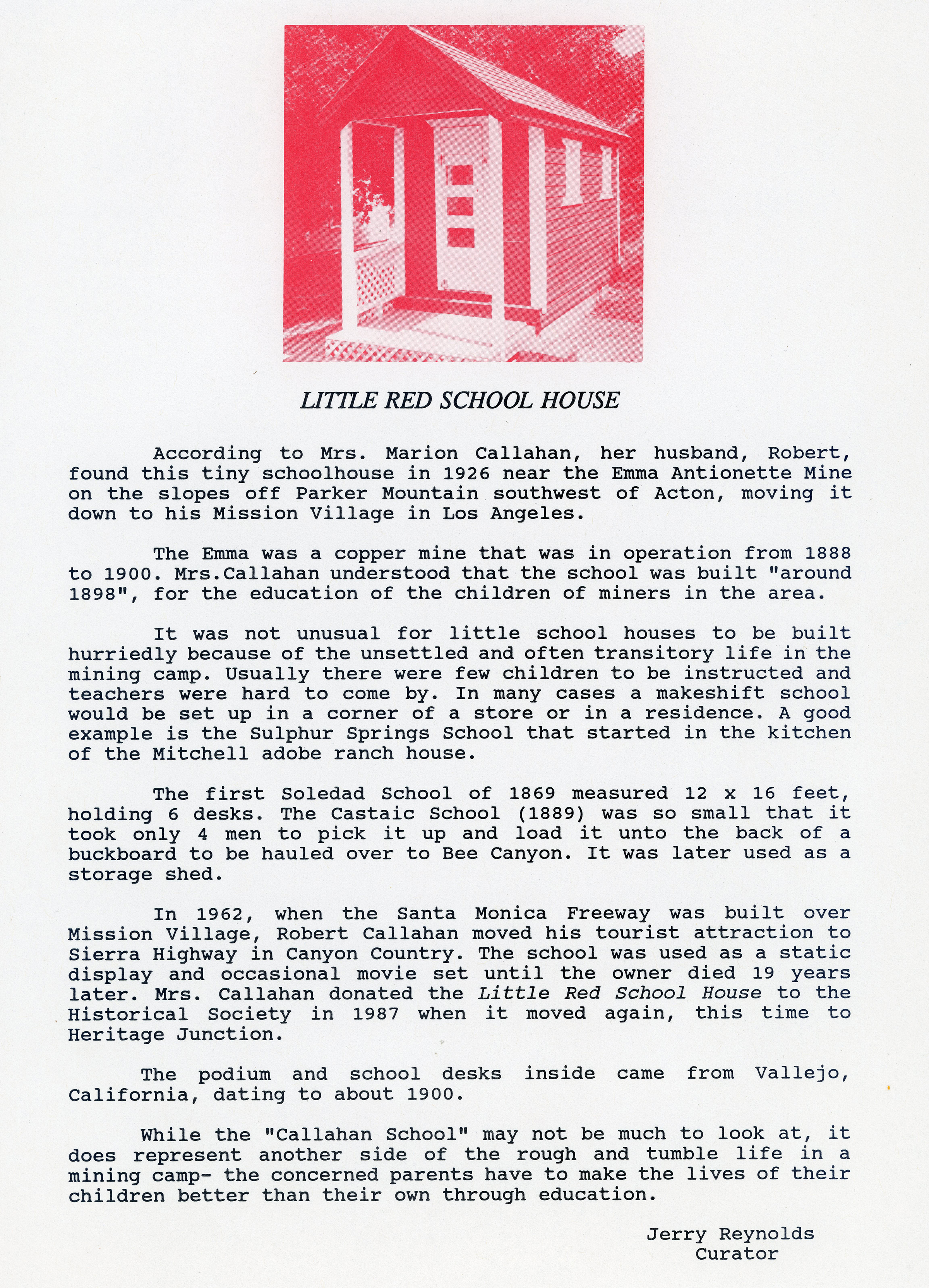 In 1962, when the Santa Monica Freeway was built over Mission Village, Robert Callahan moved his tourist attraction to Sierra Highway in Canyon Country. The school was used as a static display and occasional movie set until the owner died 19 years later. Mrs. Callahan donated the Little Red School House to the Historical Society in 1987 when it moved again, this time to Heritage Junction.