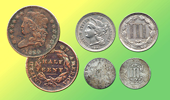 Some of America's odd-denomination coinage: A half-cent from 1825, left; a silver three-cent piece from 1856, bottom right; and its successor, a copper-nickel three-cent piece from 1881, top right.