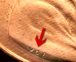 On a genuine 1914-D cent, there would be no trace of the designer's initials, "VDB," at the truncation of Lincoln's bust. If the initials are there, it's probably an altered 1944-D cent. (Photo: coppercoins.com)