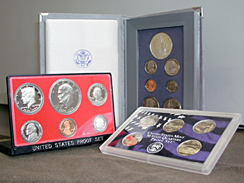 The proof's in the packaging: Along with "regular" proof sets, the U.S. Mint sold Prestige sets from 1983-97, which included the commemorative silver dollar of that year, background. A bicentennial proof set from 1976 is seen at left; today's proof sets include the five 50-State quarters for the year, right. Proof sets courtesy of Coins Plus in Newhall. (Leon Worden/The Signal)
