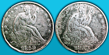 The 1858-O Seated Liberty half dollar at left is worth about $40 in this state of preservation. The 1856-O at right is a fake, like you might buy unawares at a swap meet or garage sale. This one was probably a contemporary counterfeit, made nearly 150 years ago when a half dollar was real money, but today it's still worth only the price of a blob of lead. (Photo: Leon Worden/The Signal)
