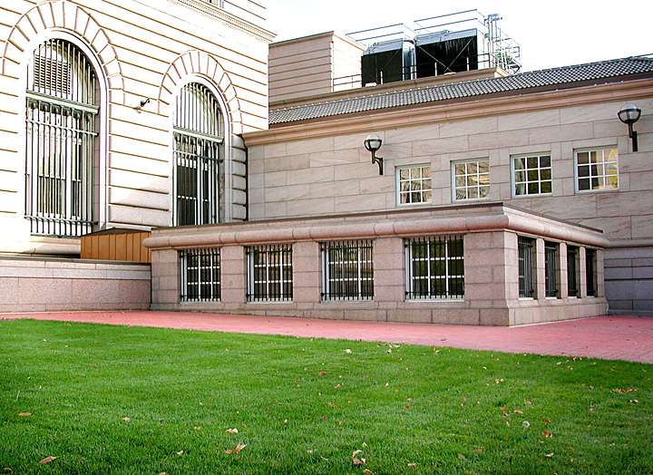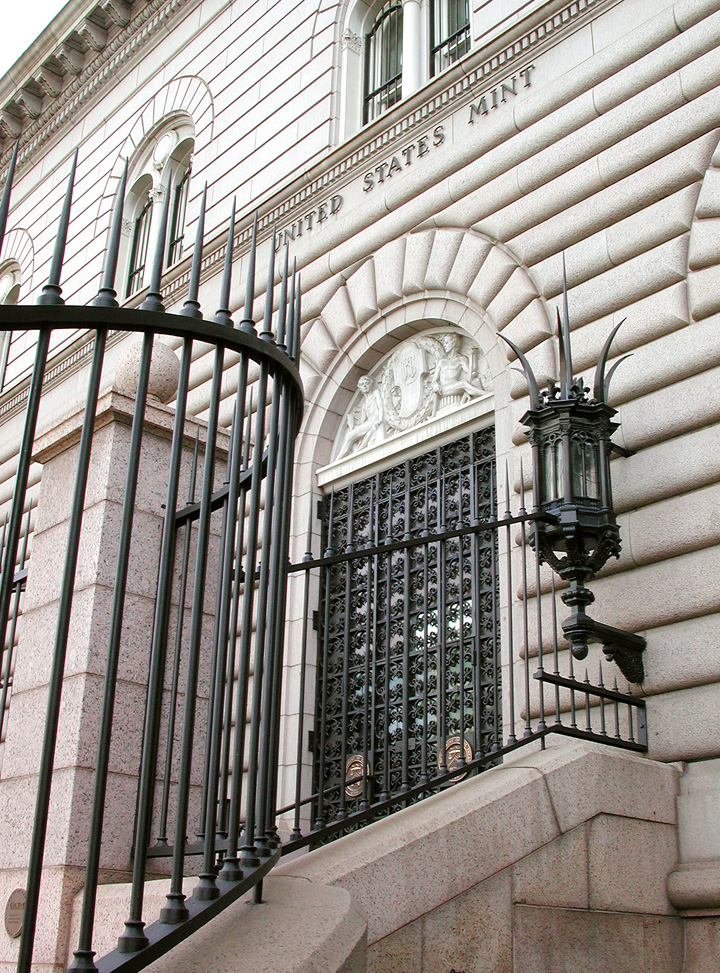 The U.S. Mint bowed to the wishes of the local government when it expanded the Denver facility in 2000. The Mint sealed off the old front entrance on Colfax Avenue and created a new entrance on Delaware Street through which all employees must pass. For the sake of a historically correct appearance, the addition included iron bars over fake, filled-in windows that are truly just indentations in the façade.