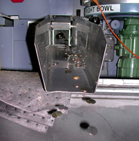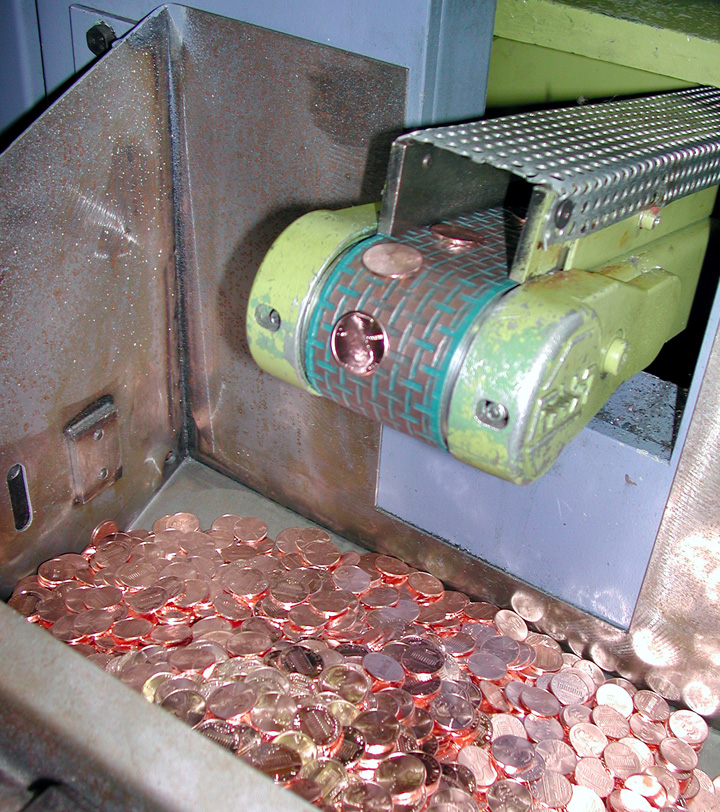 Made in the Netherlands, the waffler is one of the newest additions to the Denver Mint. Until 2002, Mint Police had to escort rejected coins back to the material suppliers, to make sure they didn’t end up in the hands of error coin collectors. Now the bad apples are fed into a machine that obliterates their design by impaling them with a raised, corrugated, waffle-like pattern that renders them impossible to slip into a vending machine.