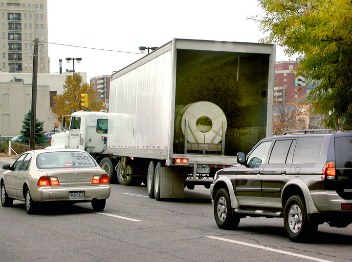 On Delaware Street, a truck delivers rolls of copper-nickel alloy from Olin Brass.