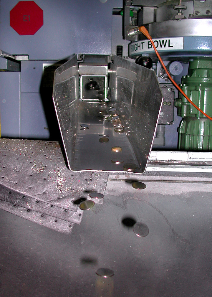 As if this process weren’t already upsetting enough to the poor little coin blanks, next comes the Schuler upsetting mill where they’re squeezed edge-wise to give them their rim. They’re fed horizontally into a groove on a wheel that spins them through a passageway that’s narrower than they are, forcing the metal to be "up-set," or to flatten outward, at the edge. (Sacagawea dollars, which have a broader rim, are upset before they’re annealed.)