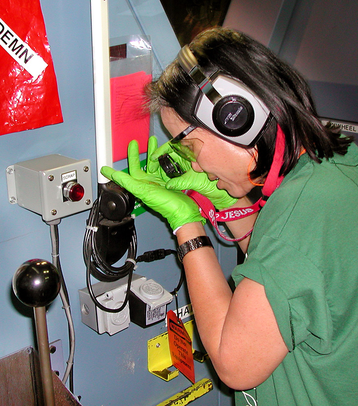 When several thousand coins have flown out of the Schuler press and into a tote box, the press operator inspects a handful and passes judgment on the whole batch. If the small sample is up to snuff, the batch is sent to the next stage. If not, the entire batch is condemned and sent to the waffler.