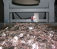 From the loading dock the coiled strip moves to one of six automated production lines. First it’s fed into a Schuler blanking press, which can punch out as many as 20 planchets with each down-stroke, depending on the diameter of the denomination. Nearly as fast as a coin press, its multiple punches can cut up to 12,000 blanks a minute. The waste material 22 percent of the nickel, dime and quarter strip, 27 percent of half-dollar strip and 25 percent of Sacagawea dollar strip is known as "webbing" or "web scrap" and is sent back to the supplier for recycling.