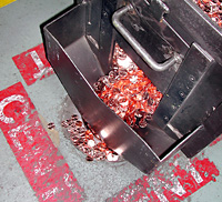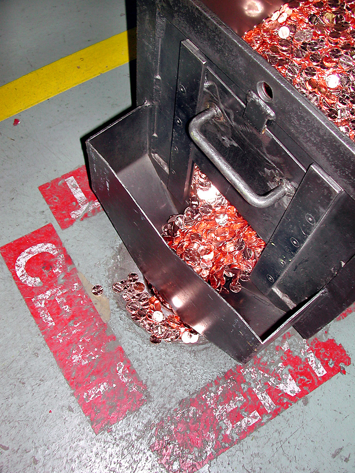 Freshly stamped Lincoln cents roll off of a Schuler press into a tote bin.