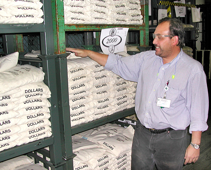 Virgil Sullivan, floor manager in the weighing and counting area, shows that Denver still has an ample supply of Sacagawea dollars from 2000. They're still in their original smaller, old-style bags.