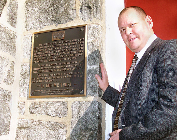 Pastor Robert Zimmerman shows the plaque that was placed in 1962 to recognize the First Particular Baptist Church, now known as Prospect Hill Baptist Church, as the birthplace of "In God We Trust."