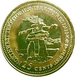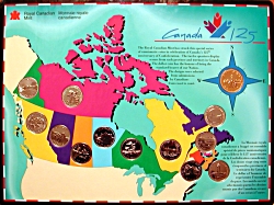 No, it's not an escapee from a mental institution. It's an oversized effigy of a 1992 Canadian dollar coin. And while it lacks the familiar loon that paddled across the back of the dominion's $1 coin since 1987, it's still a Canadian dollar so it's still called a loonie. To the people of Churchbridge, the bronze sculpture of the 1992 loonie is a show of pride, as it was Churchbridge painter Rita Swanson whose artwork was selected for the coin's reverse side in a coast-to-coast-to-coast design contest. To the citizens of Canada, Swanson's design is a reminder, in her words, "of how lucky we are to live in such a wonderful, unique and very special country." Her rendering of the federal Parliament building on the back of the coin stands as "a testament to our history," she says, while the children in the foreground represent "our future and our source of inspiration." To a visiting collector of 50-state Washington quarters from south of the border, the monument is a gentle reminder that this is one case where Canada came first. For it wasn't only the $1 coin that Canada redesigned in 1992. Swanson's loonie was the capper to a most ambitious undertaking involving a series of special 25-cent pieces. Canada issued a dozen different 25-cent pieces in 1992 at the rate of one per month. The perennial caribou design on the back give way to 12 different designs honoring each of Canada's 12 provinces and territories. (Nunavut, now the 13th, was still a part of the Northwest Territories at the time.) Canada had never issued so many different coins so quickly. But it was worth the effort. This was, after all, Canada's 125th anniversary. "Coins ... reflect our heritage and foster celebration of the symbols of Canadian identity," said Christine Aquino, spokeswoman for the Royal Canadian Mint. "As such, celebrating the 125th anniversary through coins was a natural fit." Until it was superseded more than a century later, the Act served as the constitution for the new dominion and set forth a federal government in Ottawa with an elected House of Commons, a lifetime-appointed Senate and a governor-general representing the British crown. Powers not vested in the federal government were relegated to the provinces, which established similar governmental structures. Canada's coins were made in London until 1908, when the British Royal Mint opened a branch in Ottawa. In 1931 it became a wholly Canadian institution; in 1969, it became a "Crown corporation" a for-profit, quasi-governmental entity with federal oversight, run by an independent board of directors. Canada's circulating coinage was rather static throughout that time. Obverse portraiture changed once with each new British monarch and only occasionally as Queen Elizabeth II aged; reverses changed no more frequently. So it was quite a sensation when the Royal Canadian Mint (RCM) changed the reverses of coins in every denomination for the 100th anniversary of confederation in 1967. That year only, a dove replaced the normal maple leaves on the back of the 1-cent coin; a snowshoe rabbit replaced the beaver on the 5-cent coin; an Atlantic mackerel replaced the sailboat on the 10-cent coin; a lynx replaced the caribou on the 25-cent coin; a howling wolf replaced the shield on the 50-cent coin; and a goose replaced the voyageur (canoe portrait) on the $1 coin. Each reverse design included the dual dates 1867-1967. (The Canadian Mint doesn't use terms such as "dime" and "quarter," just as the U.S. Mint doesn't say "penny" but regular folks do.) The 100th-anniversary coins were so popular that government minister Paul Dick, who oversaw the RCM in 1991, announced that the dominion would honor confederation again during the 125th anniversary year of 1992. And this time the Mint would involve the public on the front end. Entries poured in. They came from schoolchildren and senior citizens, professional artists and doodlers. Some were worthy of framing and hanging on the living-room wall. Some were worthy of cutting out and taping to the refrigerator door. Mint officials say they received 9,277 individual designs in all, including 1,111 for the loonie. Conflicting government records show a total of 11,003 submittals, with 2,871 for the loonie. Either way, they far surpassed the 939 entries received in 1973-74 when Americans were invited to recast the Washington quarter, Kennedy half dollar and Eisenhower dollar for the U.S. bicentennial.