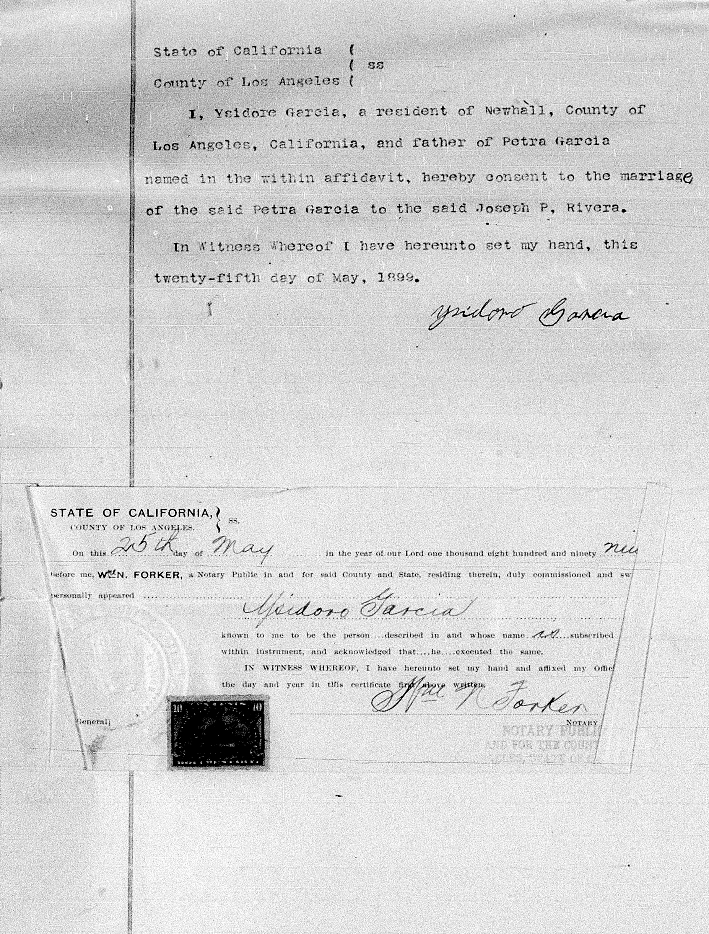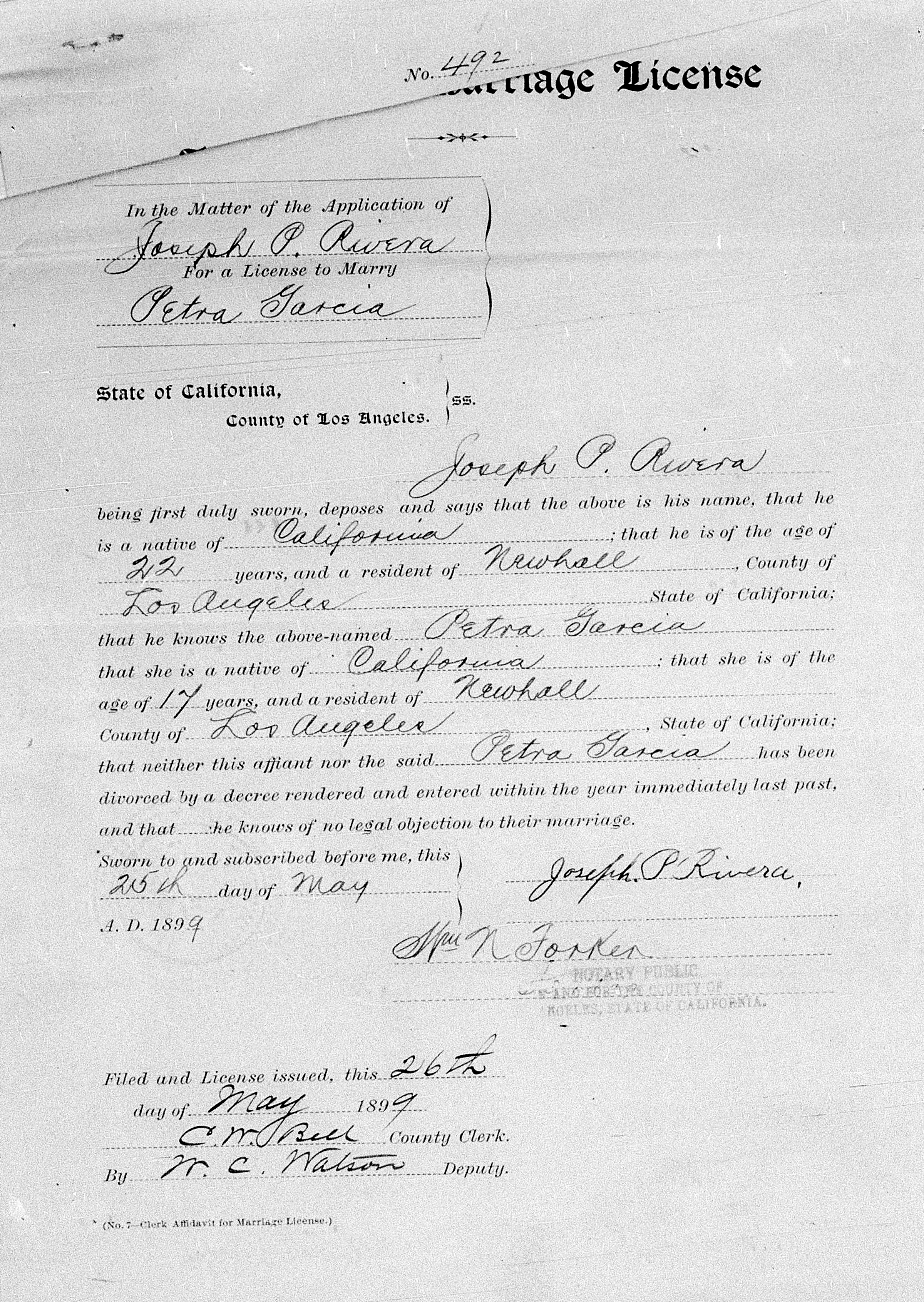 Affidavit for marriage license (below) and resulting marriage license (above) for Petra Garcia and Joseph Pedro "Pete" Rivera, wedding date May 26, 1899.